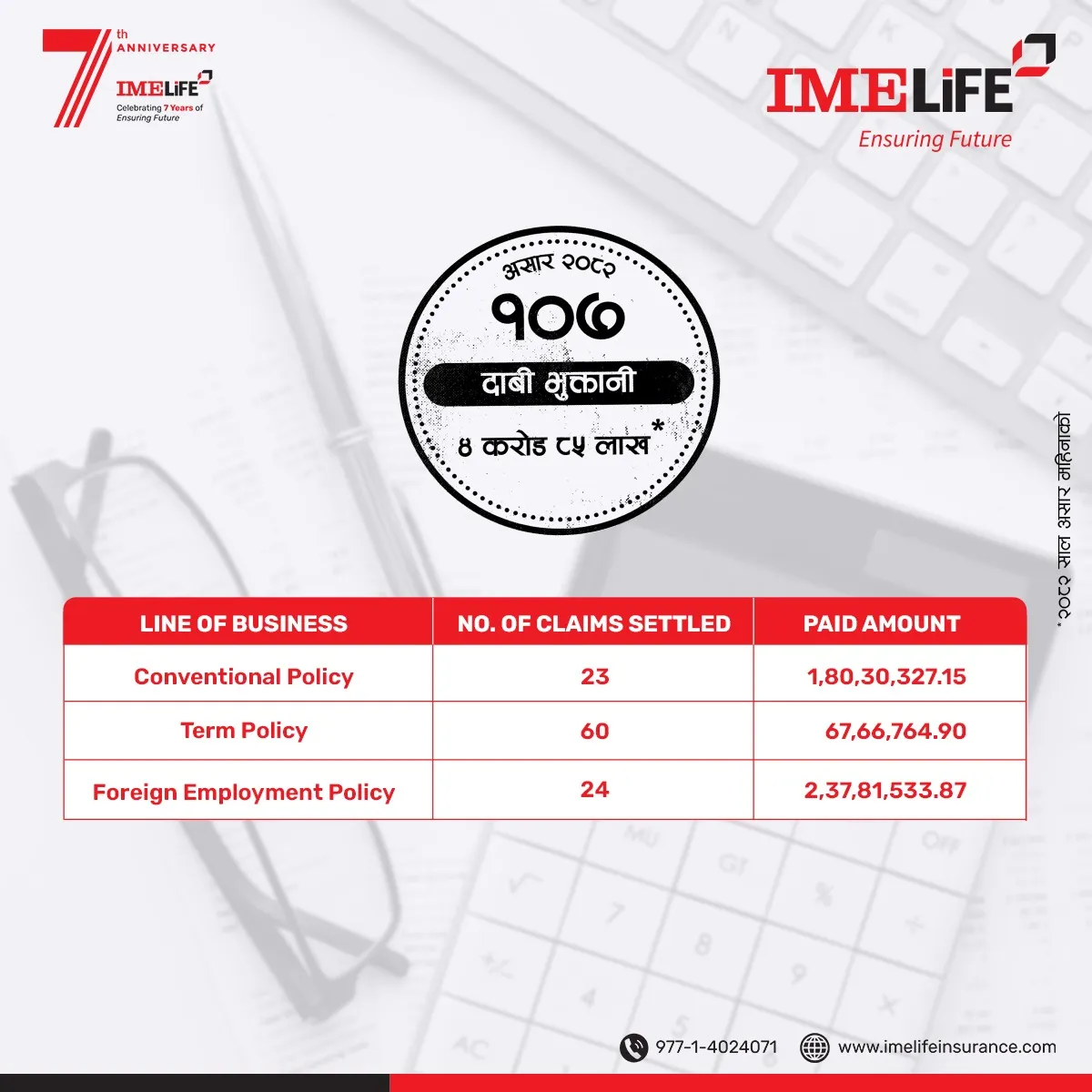 कम्पनीले २३ वटा कन्भेस्नल पोलिसीको दावी भुक्तानी वापत १ करोड ८० लाख ३० हजार ३२७ रुपैयाँ प्रदान गरेको छ । २४ फरेन इम्पोइमेन्ट पोलिसीको दाबी भुक्तानी वापत २ करोड ३७ लाख ८१ हजार ५३३ रुपैयाँ प्रदान गरेको छ भने ६० वटा टर्म पोलिसीको दाबी भुक्तानी वापत ६७ लाख ६६ हजार ७६४ रुपैयाँ प्रदान गरेको जनाइएको छ ।