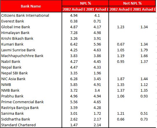 तर, सबैभन्दा बढी एनपीए हिमालयन बैंकको रहेको छ, जसको अनुपात अघिल्लो वर्षको ४.९८ प्रतिशतबाट बढेर ७.२८ प्रतिशत पुगेको छ। दोस्रो स्थानमा कुमारी बैंक ६.४२ प्रतिशत र तेस्रोमा एनआइसी एशिया बैंक ६.२८ प्रतिशतका साथ रहेका छन्। त्यस्तै, एनआइएमबी बैंकको एनपीए ५.८५ प्रतिशत र प्राइम बैंकको ५.५६ प्रतिशतमा पुगेको छ। प्रभु, सिटिजन, ग्लोबल आइएमई, लक्ष्मी सनराइज, नेपाल बैंक र नविल बैंकको एनपीए ४ प्रतिशतभन्दा बढी तर ५ प्रतिशतभन्दा कम छ।