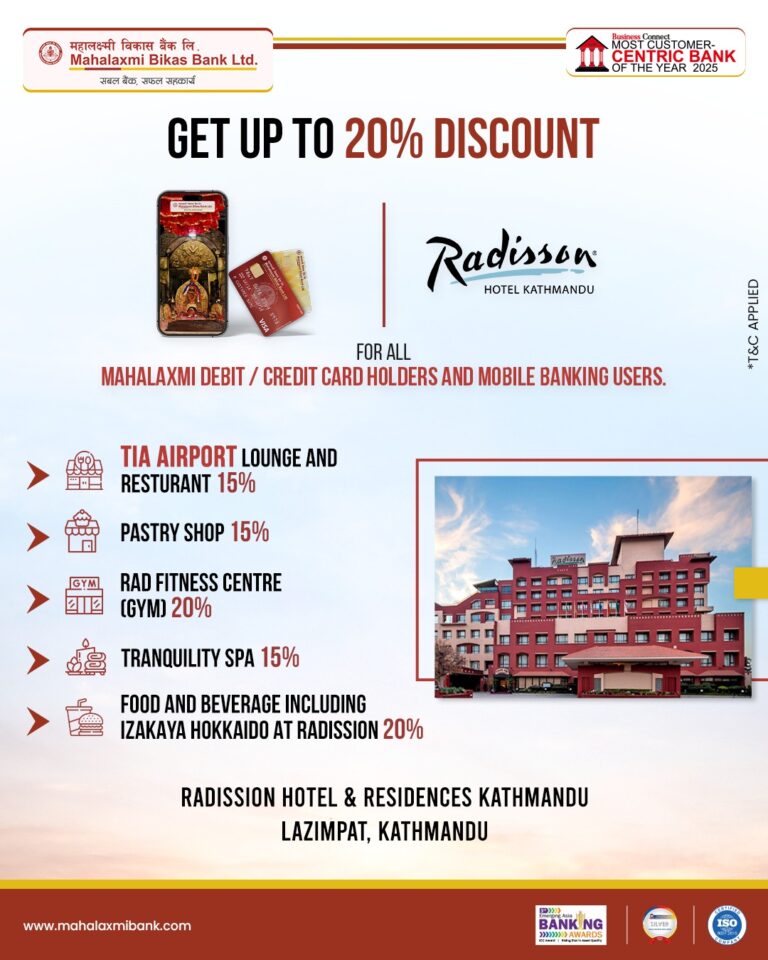 सम्झौता अन्तर्गत महालक्ष्मी विकास बैंकका डेबिट कार्ड, क्रेडिट कार्ड तथा मोबाइल बैंकिङ्ग प्रयोग गर्ने ग्राहकहरुले उक्त होटलले त्रिभुवन अन्र्तराष्ट्रिय विमानस्थलमा रहेको र्याडिसन एयरपोर्ट लाउन्जमा प्रदान गर्ने सेवा सहित विभिन्न सेवाहरुमा विशेष छुट प्राप्त गर्न सक्नेछन् ।