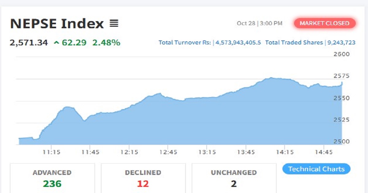 काठमाडौं । आज नेपाल शेयर बजार (नेप्से) मा ठूलो उछाल आएको छ। नेप्से परिसूचक ६२.२९ अंकले वृद्धि भई २,५७१ विन्दुमा पुग्दै बजार उच्च स्तरमा बन्द भएको छ।