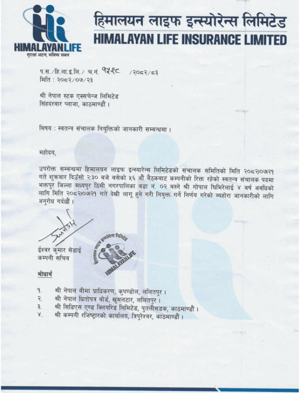 कम्पनीको सञ्चालक समितिको कात्तिक २१ गते शुक्रबार दिउँसो बसेको ५६औं बैठकले रिक्त रहेको स्वतन्त्र सञ्चालकको पदमा घिमिरेलाई नियुक्त गर्ने निर्णय गरेको हो।