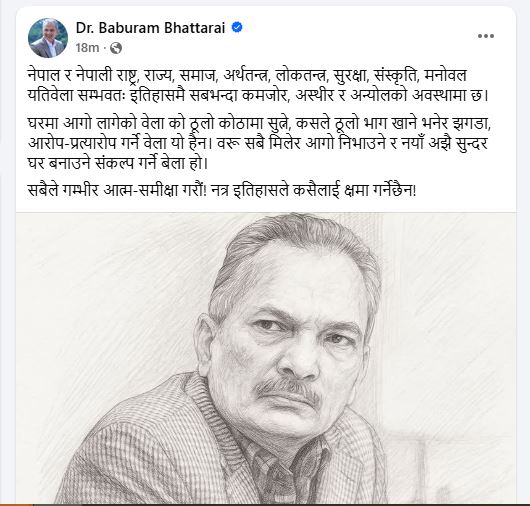 सबैले गम्भीर आत्मसमीक्षा गर्न नसके इतिहासले कसैलाई क्षमा नगर्ने समेत बताएका छन्। ‘घरमा आगो लागेको वेला को ठुलो कोठामा सुत्ने, कसले ठुलो भाग खाने भनेर झगडा, आरोप-प्रत्यारोप गर्ने वेला यो हैन’, उनले लेखेका छन्,‘बरु सबै मिलेर आगो निभाउने र नयाँ अझै सुन्दर घर बनाउने सङ्कल्प गर्ने बेला हो।’