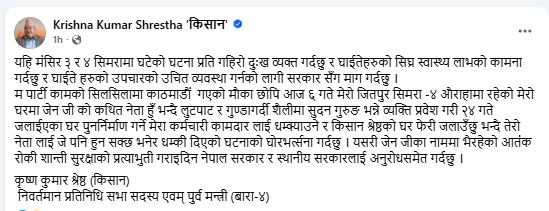 एमाले नेता श्रेष्ठले जेन-जीका नाममा भइरहेको आतंक रोकी शान्ति सुरक्षाको प्रत्याभूति दिन सरकारसमक्ष माग गरेका छन् । उनले ३ र ४ गते सिमरामा भएको प्रदर्शनका क्रममा घाइते भएका सबैको शीघ्र स्वास्थ्यलाभको कामना गरेका छन् ।