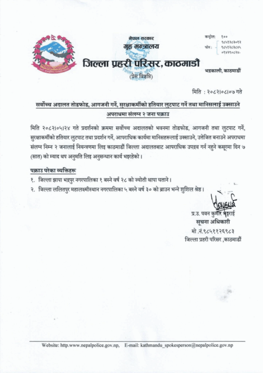 काठमाडौं । सर्वोच्च अदालत तोडफोड, सुरक्षाकर्मीको हतियार लुटपाट र आगजनी गरेको आरोपमा दुई पक्राउ परेका छन् ।