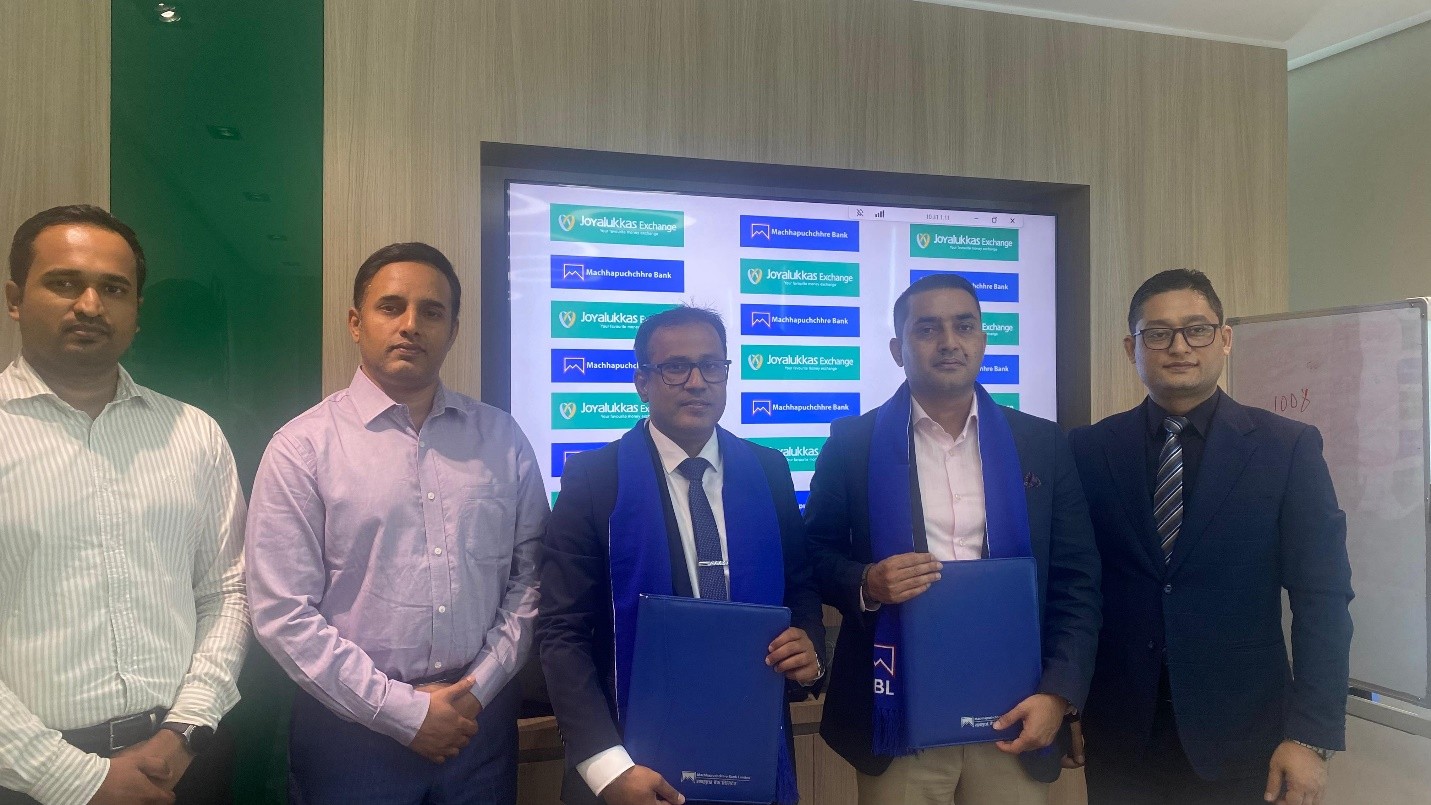 काठमाडौं । विदेशबाट नेपालमा भित्रिने रेमिट्यान्सलाई अझ सहज, सरल तथा विश्वासिलो बनाउने उद्धेश्यका साथ माछापुच्छ्रे बैंक र जोयालुक्कास एक्सचेन्ज यूएईबीच रेमिट्यान्स सेवा सम्झौता बैंकले संयुक्त अरब इमिरेट्स स्थित जोयालुक्कास एक्सचेन्जसंग औपचारिक सम्झौता गरेको छ ।