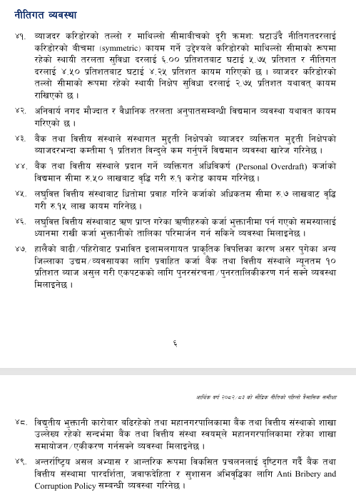 -ब्याजदर माथिल्लो सीमा अर्थात् स्थायी तरलता सुविधा दरलाई ६.०० प्रतिशतबाट घटाई ५.७५ प्रतिशत र नीतिगत दरलाई ४.५० प्रतिशतबाट घटाई ४.२५ प्रतिशत कायम