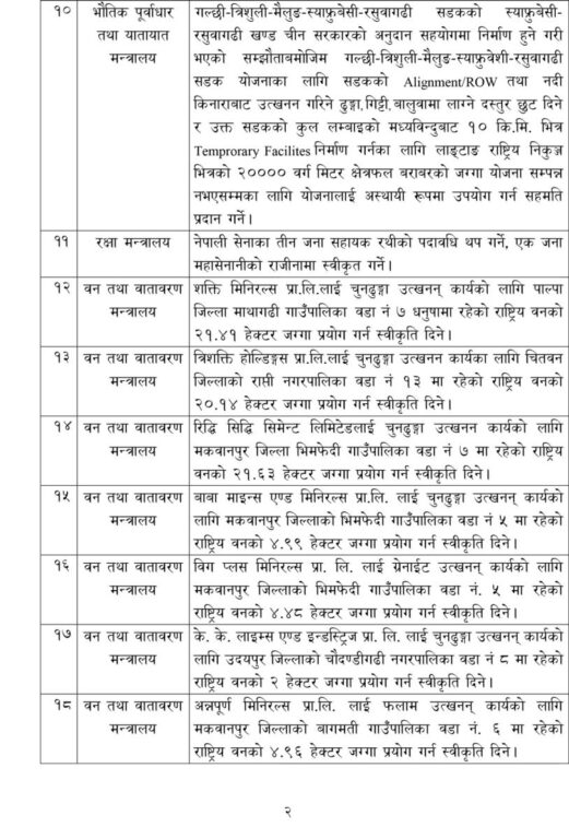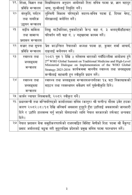 यस्तै, विश्वविद्यालय अनुदान आयोगको सचिव पदमा प्रा. ज्ञानबहादुर थापा, प्रेस काउन्सिल नेपालको अध्यक्ष पदमा डा. कुमार शर्मा आचार्यलाई नियुक्त गर्ने निर्णय भएको छ । कार्बन व्यापार नियमावली २०८२ स्वीकृत गर्ने निर्णय पनि गरिएको छ । राजपत्राङ्कित विशिष्ट श्रेणीको रिक्त सचिव पदमा वैकुण्ठप्रसाद अर्याललाई बढुवा गरिएको छ ।