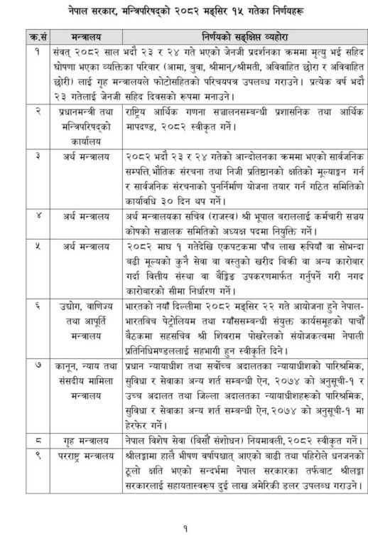 बैठकले भदौ २३ र २४ गतेको प्रदर्शनमा मृत्यु भई सहिद घोषणा गरेका परिवारलाई गृह मन्त्रालयले तस्बिरसहितको परिचयपत्र दिने निर्णय गरेको प्रवक्ता खरेलले सञ्चारकर्मीलाई जानकारी दिए । यस्तै, प्रत्येक वर्ष भदौ २३ गतेलाई ‘जेनजी सहिद दिवस’का रूपमा मनाउने निर्णयसमेत गरिएको उनले बताए ।