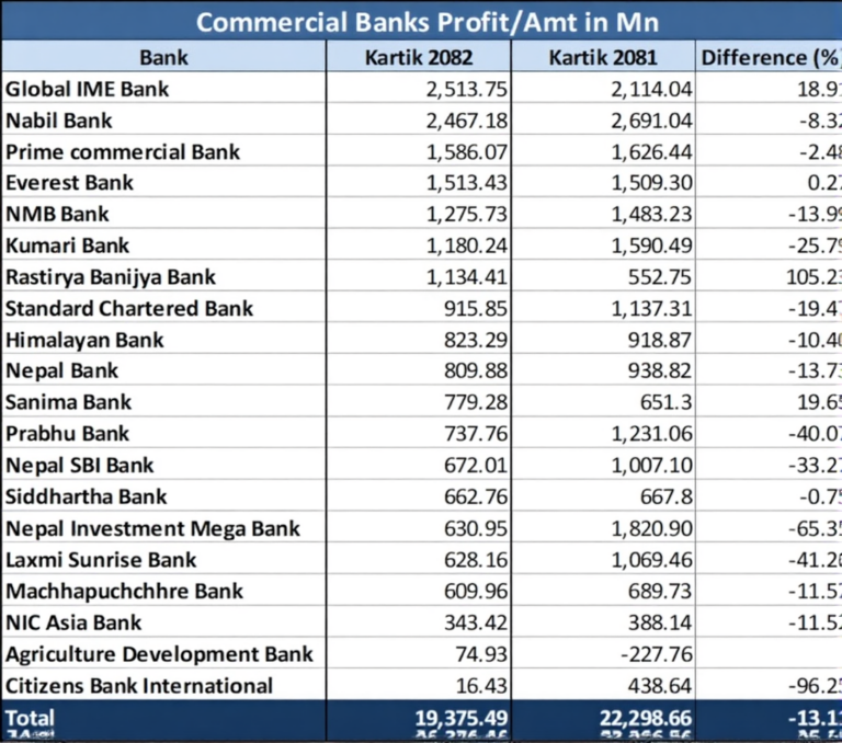 काठमाडौं । वाणिज्य बैंकहरुले चालु आर्थिक वर्षको पहिलो ४ महिना कात्तिकसम्म १९ अर्ब ३७ करोड रुपैयाँ नाफा कमाएका छन्। नेपाल राष्ट्र बैंकले सार्वजनिक गरेको चालु आर्थिक वर्षको कात्तिकसम्मको तथ्यांक अनुसार २० वाणिज्य बैंकहरुको नाफा १९ अर्ब ३७ करोड ५४ लाख रुपैयाँ देखिएको हो। अघिल्लो वर्ष २०८१।८२ को कात्तिकसम्म वाणिज्य बैंकहरुले २२ अर्ब २९ करोड ८६ लाख रुपैयाँ नाफा आर्जन गरेका थिए। अघिल्लो वर्षको तुलनामा समीक्षा अवधिमा बैंकहरुको नाफा १३.११ प्रतिशतले घटेको छ।