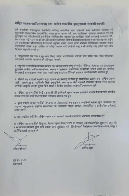 आइतबार बिहान भएको सहमतिपत्रमा रवि लामिछाने र बालेन्द्र शाहले हस्ताक्षर गरेका छन् । एकीकरणपछि पार्टीको नाम राष्ट्रिय स्वतन्त्र पार्टी र चुनाव चिह्न घण्टी रहने भएको छ ।