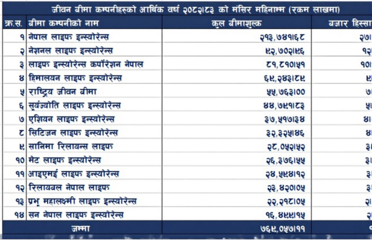 त्यस्तै, राष्ट्रिय जीवन बीमा कम्पनीले ५ अर्ब ५७ करोड बीमाशुल्क संकलन गरेको छ । सूर्यज्योति लाइफले ४ अर्ब ४७ करोड बीमाशुल्क संकलन गरेको छ । एशियन लाइफले ३ अर्ब ७५ करोड बीमाशुल्क संकलन गरेको छ । सिटिजन लाइफले ३ अर्ब २३ करोड बीमाशुल्क संकलन गरेको छ । सानिमा रिलाइनस लाइफले २ अर्ब ८० करोड बीमाशुल्क संकलन गरेको छ । मेट लाइफले २ अर्ब ६३ करोड बीमाशुल्क संकलन गरेको छ । आइएमई लाइफले २ अर्ब ४५ करोड बीमाशुल्क संकलन गरेको छ।