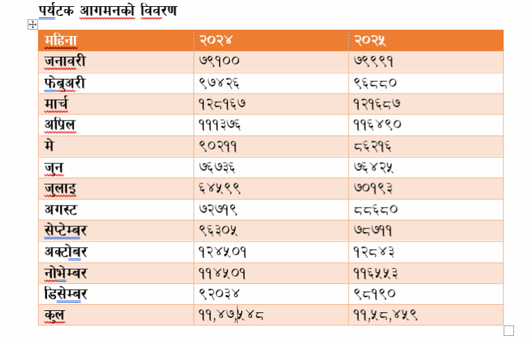 काठमाडौं । सन् २०२५ मा नेपालमा साढे ११ लाख विदेशी पर्यटकको आगमन भएको छ। नेपाल पर्यटन बोर्डका अनुसार जनवरीदेखि डिसेम्बरसम्मका १२ महिनामा कुल ११ लाख ५८ हजार ४५९ जना विदेशी पर्यटकले नेपालमा भ्रमण गरेका छन्।