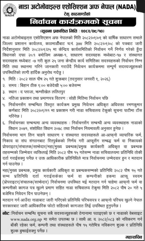 काठमाडौं । नाडा अटोमोबाइल्स एशोसियसन अफ नेपाल (नाडा)को अध्यक्षमा सुरेन्द्रकुमार उप्रेती निर्विरोध निर्वाचित भएका छन् ।