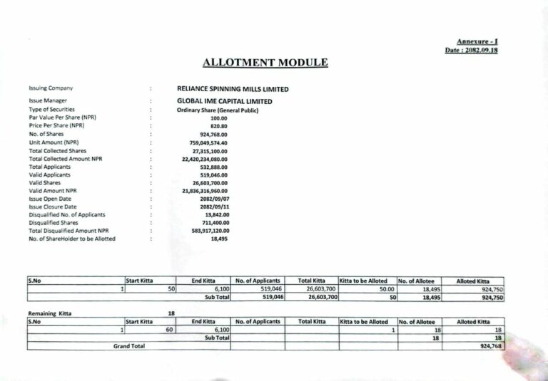 रिलायन्स मिल्सको आईपीओ बाँडफाँट, १८ जनालाई थप १ कित्ता