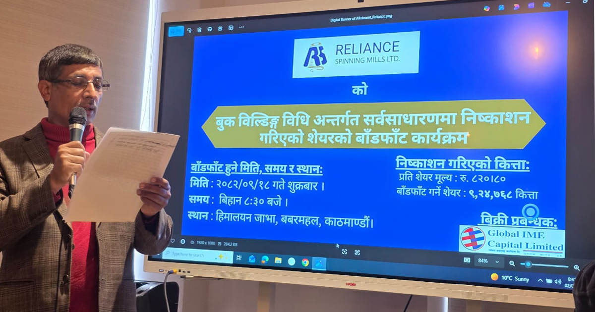 काठमाडौं । रिलायन्स स्पिनिङ मिल्स लिमिटेडको प्रारम्भिक सार्वजनिक निष्कासन (आईपीओ) बाँडफाँड सम्पन्न भएको छ। कम्पनीले सर्वसाधारणका लागि पुस ७ गतेदेखि ११ गतेसम्म खुला गरेको आईपीओ शुक्रबार बाँडफाँड गरिएको हो।
