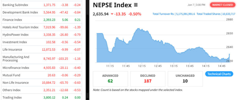 नेप्सेमा आज १३ समूहका कारोबार भएकामा फाइनान्स र व्यापार समूहको मात्र सूचक बढे भने बाँकी सबै (११ समूह) घटे।