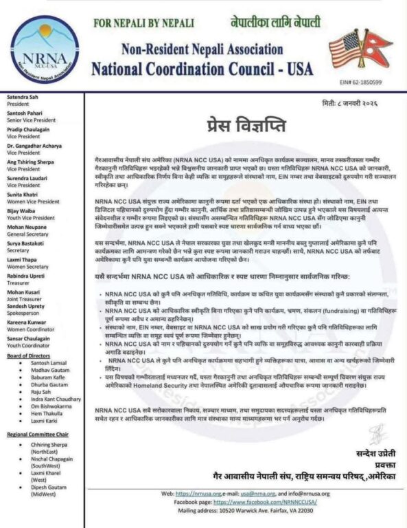 एनआरएनए अमेरिकाले आफ्नो नाम, कर परिचय नम्बर तथा डिजिटल पहिचानको दुरुपयोग गर्दै अनधिकृत कार्यक्रमहरू सञ्चालन भइरहेको विषयमा गम्भीर चिन्ता व्यक्त गरेको छ। साथै, यस्ता गतिविधिमा मानव तस्करीजस्ता गम्भीर गैरकानुनी कार्यसमेत संलग्न हुन सक्ने विश्वसनीय जानकारी प्राप्त भएको विज्ञप्तिमा उल्लेख छ।