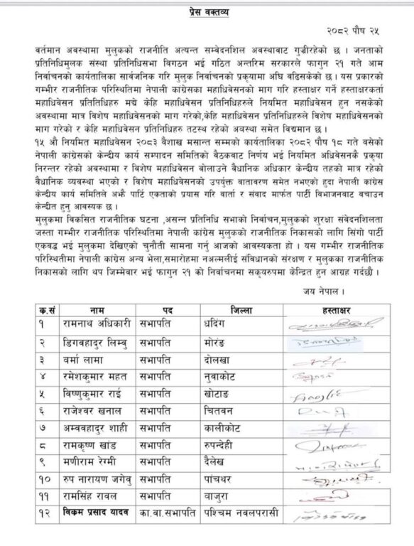 काठमाडौं । मुलुक संवेदनशील राजनीतिक अवस्थामा गुज्रिरहेको भन्दै नेपाली कांग्रेसका १२ जिल्लाका सभापतिहरूले विशेष महाधिवेशनको मागप्रति असहमति जनाएका छन्। उनीहरूले पार्टी एकता जोगाउँदै नियमित महाधिवेशन र निर्वाचनमा केन्द्रित हुनुपर्नेमा जोड दिएका छन्।