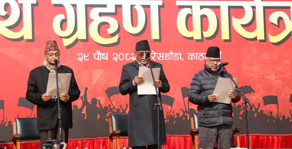 काठमाडौं । नेपाली कम्युनिस्ट पार्टीका संयोजक पुष्पकमल दाहाल ‘प्रचण्ड’ र सहसंयोजक माधवकुमार नेपालले पार्टीको शपथ लिएका छन्।