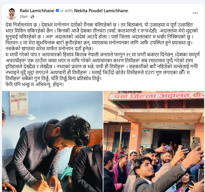 अरू अदालतको आदेश आउँदै होला। पर्सा जिल्ला अदालतबाट म भर्खर निस्किएको छु। चितवन–२ मा मेरा शुभचिन्तक बाटो कुरिरहेका छन्, भ्याएसम्म मनोनयनका लागि आफैँ उपस्थित हुने प्रयासमा छु। नसकेको खण्डमा वारेस मार्फत मनोनयन दर्ता हुनेछ।