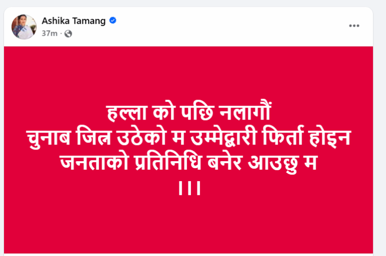 काठमाडौं । धादिङ क्षेत्र नम्बर १ बाट रास्वपाकी उम्मेदवार आशिका तामाङले आफूले उम्मेदवारी फिर्ता नलिने बताएकी छन् ।
