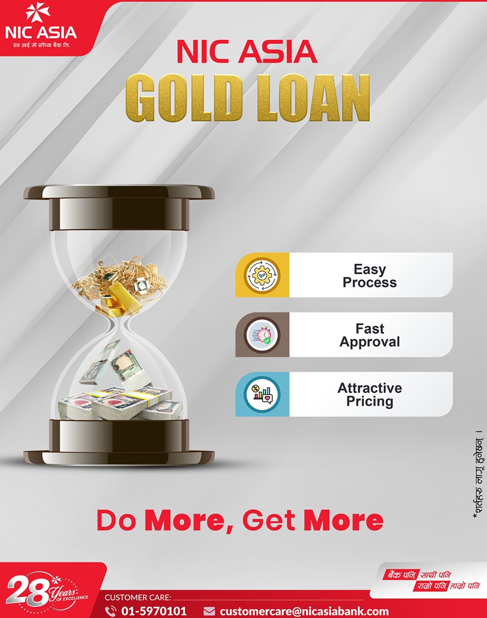 काठमाडौँ । एनआईसी एशिया बैंकले १ देखि ३ प्रतिशतसम्मको प्रिमियम सुविधा भएको प्रतिस्पर्धी ब्याजदरमा सुन तथा सुनका गरगहना धितो राखेर प्रवाह गरिने आकर्षक गोल्ड लोन कर्जा योजना सार्वजनिक गरेको छ । समय अनुसारको आवश्यकता र मागहरूलाई सम्बोधन गर्दै बैंकले ग्राहकहरूमाझ प्रतिस्पर्धी ब्याजदरमा ‘गोल्ड लोन’ योजना सार्वजनिक गरेको हो ।