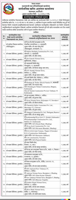 सार्वजनिक सूचना अनुसार काठमाडौंको पिएनडि शेर्पा कन्स्ट्रक्सन, पवित्र मल्टिपल कन्स्ट्रक्सन, भक्तपुरको ओम गणेश निर्माण सेवा, काठमाडौंको च्यांगरासी निर्माण सेवा, धादिंगको डीपी कँडेल निर्माण सेवा र पृथ्वी निर्माण सेवा, काठमाडौंको हिमदुंग एण्ड थोकर, हिरा एण्ड नमिता जेभी, हिमदुँग एण्ड थोकर कन्स्ट्रक्सन, धादिंगको पूजा कन्स्ट्रक्सन, चितवनको चिता एण्ड सल्लेरी एसोसिएसन, नुवाकोटको सियोन निर्माण सेवालगायतका कम्पनीहरुलाई सरकारले एक वर्षको लागि कालोसूचीमा राखेको छ ।
