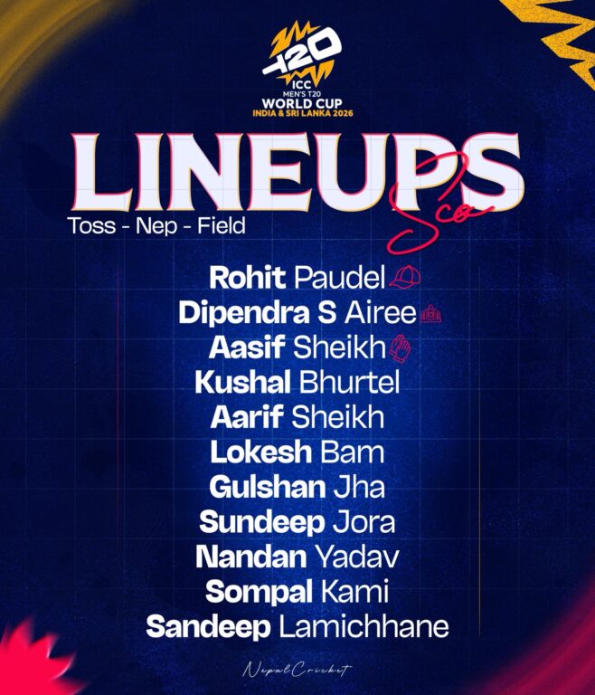 काठमाडौं । टी–२० विश्वकप अन्तर्गत समूह ‘सी’ को अन्तिम खेलमा आज नेपालले स्कटल्याण्डसँग प्रतिस्पर्धा गर्दैछ। खेल भारतको वानखेडे स्टेडियम मा केही बेरमा सुरु हुँदैछ।