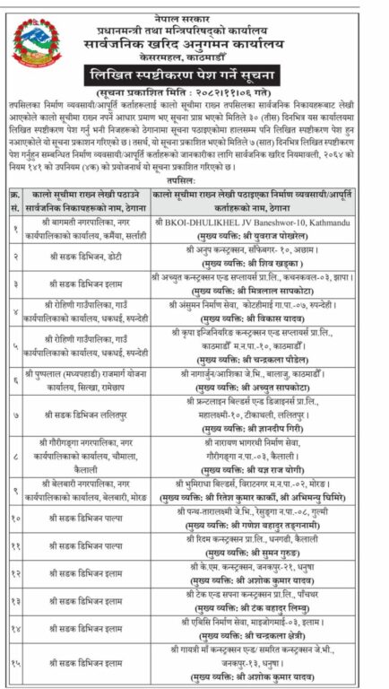 सार्वजनिक खरिद नियमावली, २०६४ को नियम १४१ को उपनियम (४ क) बमोजिम यो सूचना प्रकाशित गरिएको कार्यालयले जनाएको छ । तोकिएको समयभित्र स्पष्टीकरण नआएमा ती कम्पनीहरूलाई कालो सूचीमा राख्ने प्रक्रिया अगाडि बढाइने छ ।