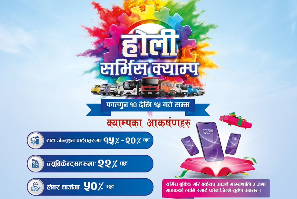 काठमाडौँ । नेपालीहरूको महान पर्व होली नजिकिँदै गर्दा सवारी साधनको प्रयोग बढ्ने भएकाले सुरक्षित यात्रालाई प्राथमिकता दिँदै सिप्रदी ट्रेडिङले टाटा कमर्सियल गाडीहरूका लागि विशेष “होली सर्भिस क्याम्प” आजदेखि सुरु गरेको छ।