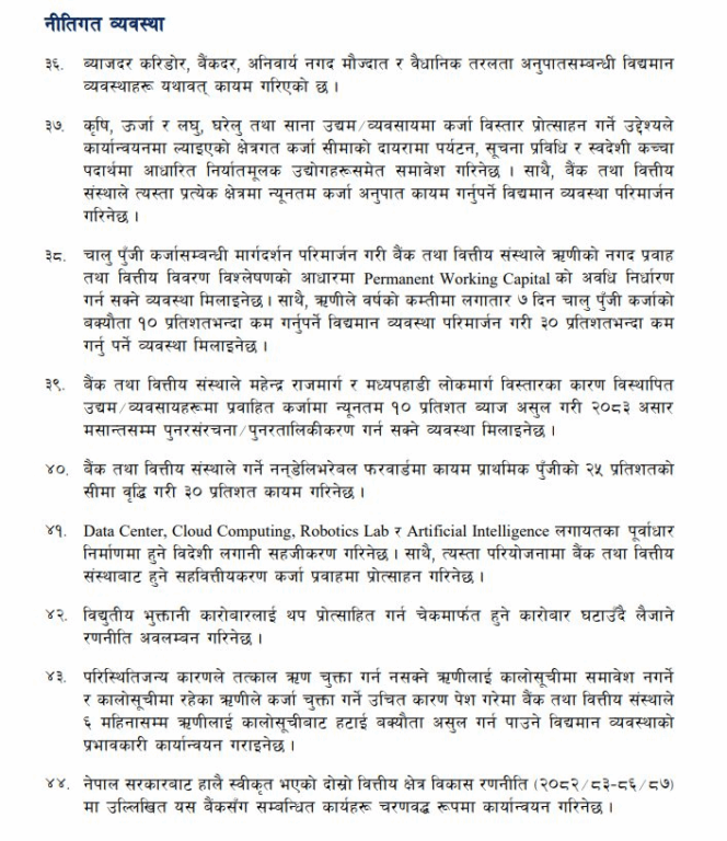 त्यस्तै, महेन्द्र राजमार्ग र मध्यपहाडी लोकमार्ग विस्तारका कारण विस्थापित उद्यम/व्यवसायलाई प्रवाहित कर्जामा न्यूनतम १० प्रतिशत ब्याज असुल गर्दै २०८३ असार मसान्तसम्म पुनरसंरचना वा पुनरतालिकीकरण गर्न सकिनेछ। बैंक तथा वित्तीय संस्थाले गर्ने नन्डेलिभरेबल फरवार्ड (NDF) कारोबारमा कायम प्राथमिक पुँजीको २५ प्रतिशतको सीमा बढाएर ३० प्रतिशत पुर्याइने भएको छ।