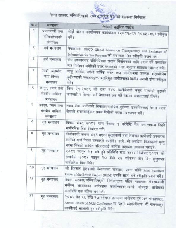 चुनावका लागि चीनले दिने ५८ करोड नगद अनुदान लिनेसहित यी हुन् सरकारका २५ निर्णय