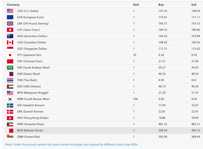 आज बहराइन दिनार १ को खरिदर ३९० रुपैयाँ ५४ पैसा र बिक्रीदर ९२ रुपैयाँ १३ पैसा छ। हिजो बहराइन दिनार १ को खरिदर ३८८ रुपैयाँ १६ पैसा र बिक्रीदर ३८९ रुपैयाँ ७५ पैसा थियो।