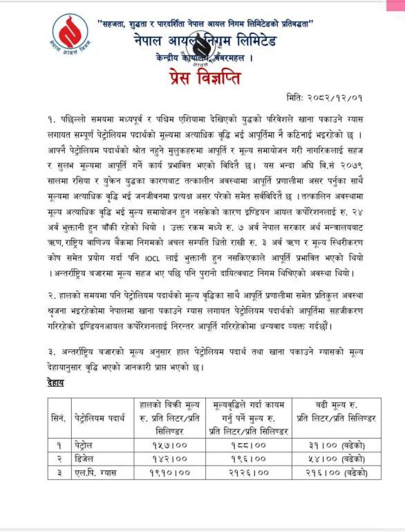 वृद्धि भएको मूल्य आजै राति १२ बजेबाट लागू हुने निगमले जनाएको छ । अमेरिका–इजरायल–इरान तनावबीच देखिएको अन्तर्राष्ट्रिय परिस्थितिका कारण मूल्य वृद्धि गर्नुपरेको निगमतले जनाएको छ ।
