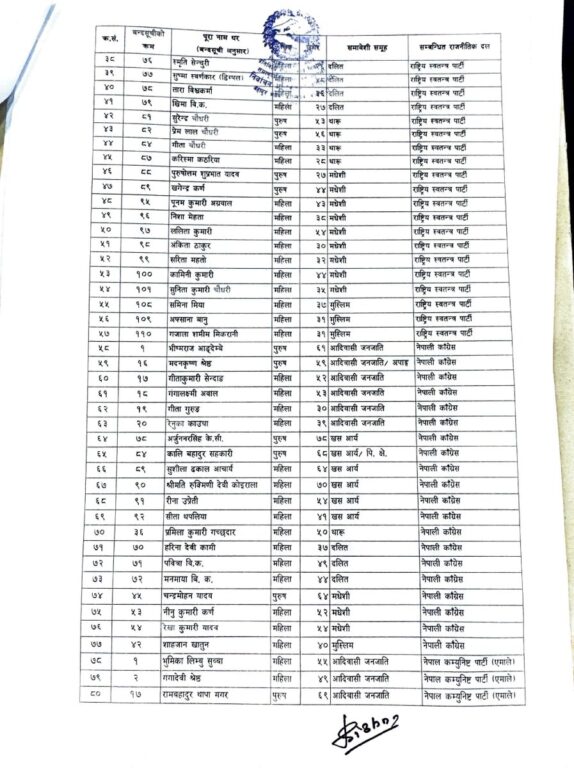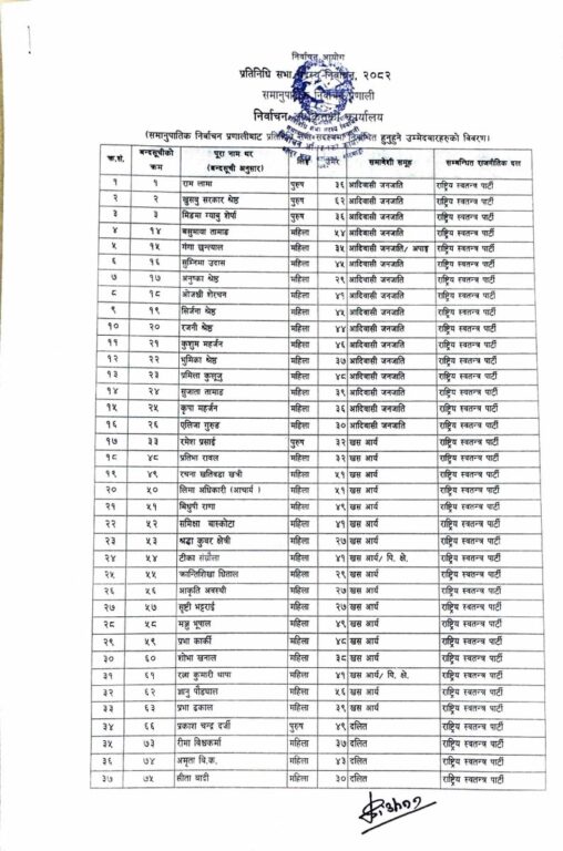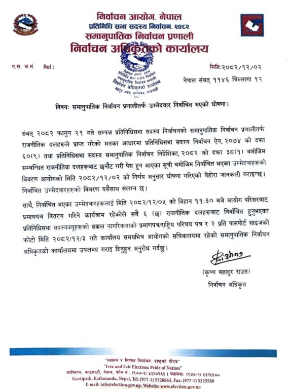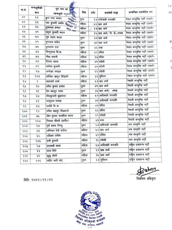प्रतिनिधि सभाकाे २७५ सिटमध्ये १६५ प्रत्यक्ष र ११० सिट समानुपातिकतर्फ निर्वाचित हुने व्यवस्था छ। सोही अनुसार, आयोगले ११० जनाको नाम सार्वजनिक गरेको हो।