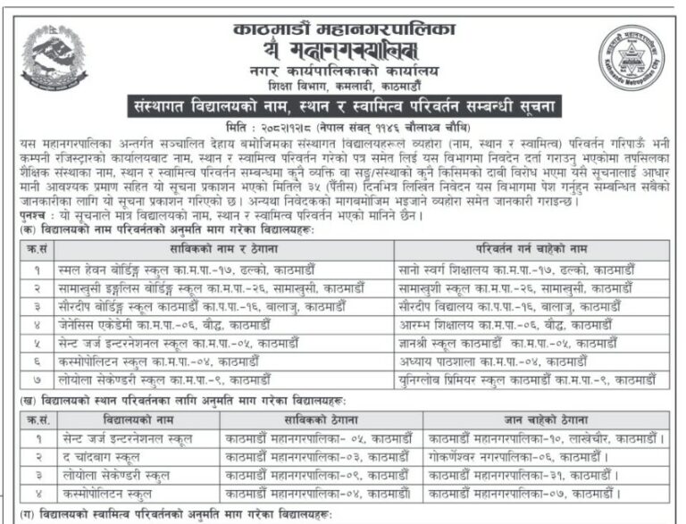 काठमाडौँ महानगरमा सञ्चालित सातवटा विद्यालयले नाम र ठेगाना परिवर्तन गर्ने