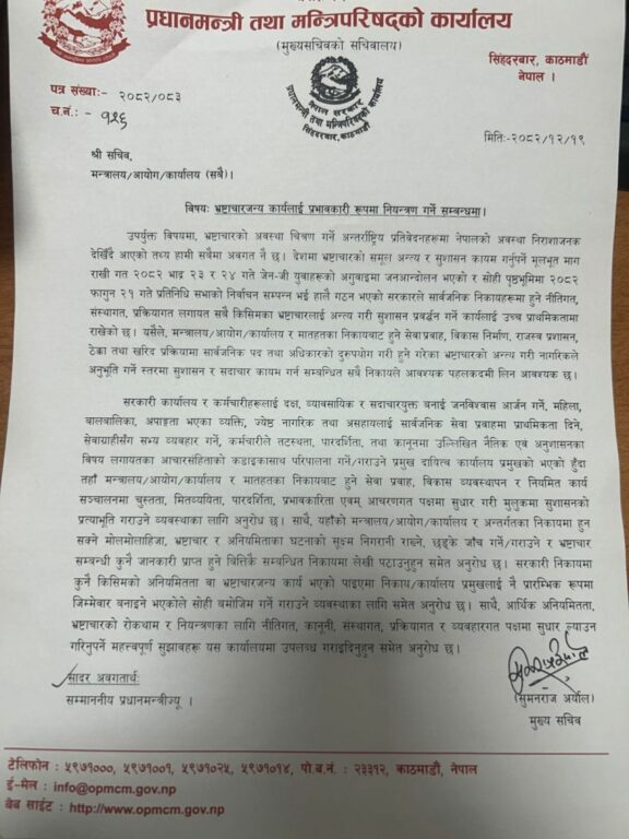 मुख्यसचिव सुमनराज अर्यालले सबै मन्त्रालय, आयोग र कार्यालयका सचिवहरूलाई परिपत्र गर्दै सुशासन कायम गर्न निर्देशन दिएका हुन्।