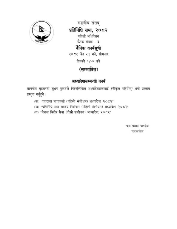 संघीय संसद् सचिवालयका महासचिव पद्मप्रसाद पाण्डेयका अनुसार गृहमन्त्री सुधन गुरुङले ‘मतदाता नामावली (पहिलो संशोधन), अध्यादेश २०८२’, ‘प्रतिनिधिसभा सदस्य निर्वाचन (पहिलो संशोधन) अध्यादेश, २०८२’ र ‘नेपाल विशेष सेवा (दोस्रो संशोधन) अध्यादेश, २०८२’ स्वीकृत गरियोस् भन्ने प्रस्ताव पेस गर्ने सम्भावित कार्यसूची छ।