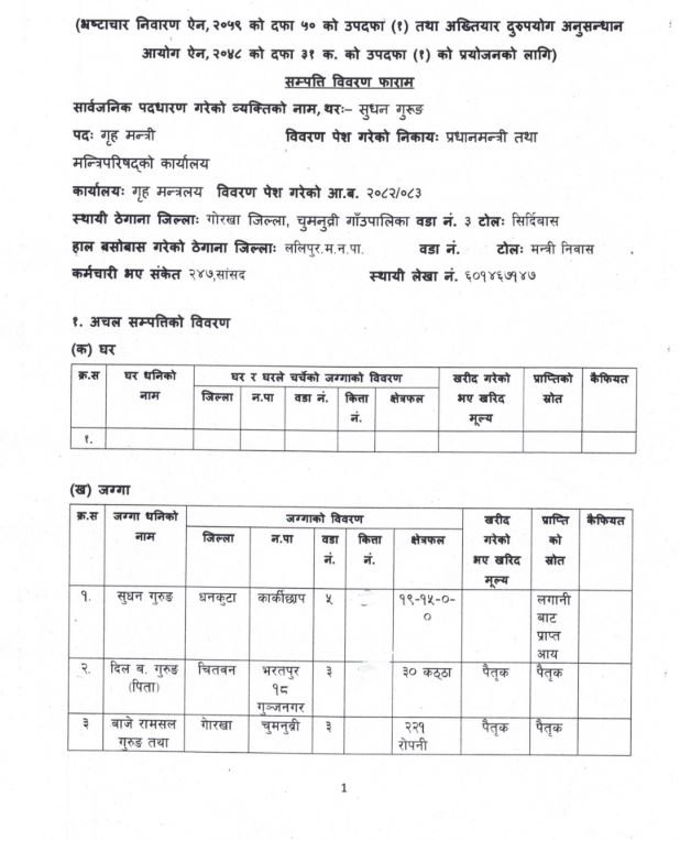 काठमाडौं । गृहमन्त्री सुधन गुरूङ सम्पत्ति शुद्धीकरण अनुसन्धानमा परेका व्यक्तिहरूसँग व्यवसायिक सम्बन्धमा रहेको तथ्य सार्वजनिक भएपछि उनको पारदर्शितामाथि गम्भीर प्रश्न उठेको छ ।