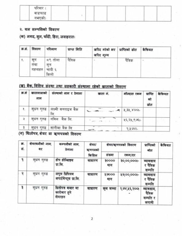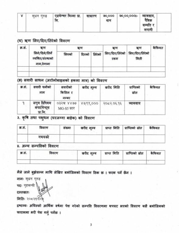 तर, गृहमन्त्री गुरूङले हालै प्रधानमन्त्री तथा मन्त्रिपरिषद् कार्यालयमा बुझाएको सम्पत्ति विवरणमा भने उक्त इन्स्योरेन्स कम्पनीमा रहेको सेयरबारे उल्लेख गरेका छैनन् । उनले आफ्नो विवरणमा होप होल्डिङ्स र अनुज प्रमियम अपार्टमेन्ट्समा मात्रै संस्थापक सेयर रहेको उल्लेख गरेका छन् भने धितोपत्र बजारमा कारोबार हुने सेयरतर्फ २ करोड ७४ लाख रुपैयाँ बराबरको लगानी देखाएका छन् ।