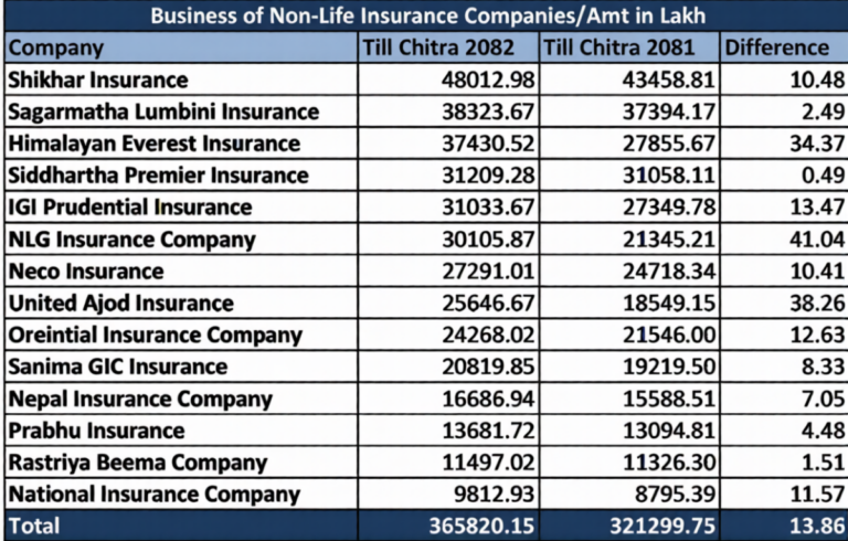 अघिल्लो आर्थिक वर्ष २०८१/८२ को सोही अवधिमा २१ लाख ३५ हजार २३३ बीमालेखबाट ३२ अर्ब १२ करोड ९९ लाख रुपैयाँ बीमाशुल्क संकलन भएको थियो। यस आधारमा चालु वर्षमा निर्जीवन बीमा क्षेत्रको व्यापार १३.८६ प्रतिशतले वृद्धि भएको देखिएको छ।