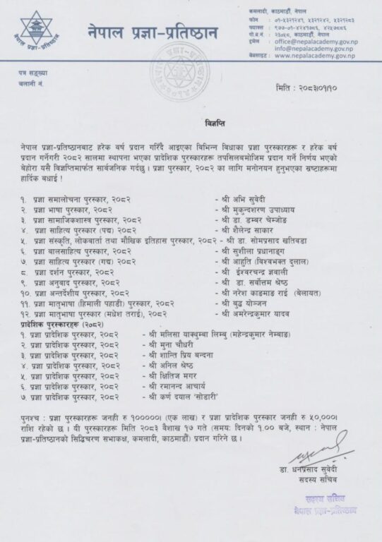 काठमाडौं। नेपाल प्रज्ञाप्रतिष्ठानले हरेक वर्ष भाषा,साहित्य,संस्कृति, दर्शनशास्त्र र सामाजिकशास्त्र विधाका विभिन्न प्रज्ञा पुरस्कारहरू-२०८२ घोषणा गरेको छ।